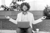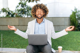 Break during work. Calm relaxed curly haired hispanic or brazilian man, office employee, sits outdoors near the business center, meditates, relaxes, closed his eyes, takes care of mental health, smile