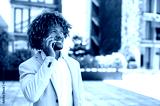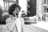 Positive confident handsome curly haired brazilian or latino man, successful ceo, entrepreneur, talking on smartphone, having conversation with friend or client, looking straight ahead, smiling