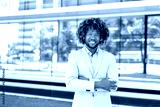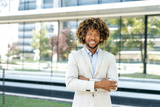 Portrait of a confident successful elegant curly mixed race man, entrepreneur, company executive, stand outdoors against the backdrop of a business center with crossed arms, looking at camera, smiling