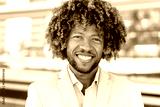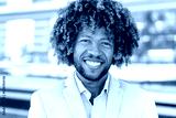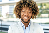Close-up photo of a confident successful elegant curly haired mixed race man, brazilian or latino entrepreneur, company executive, stand outdoors, looking at camera, smiling friendly