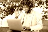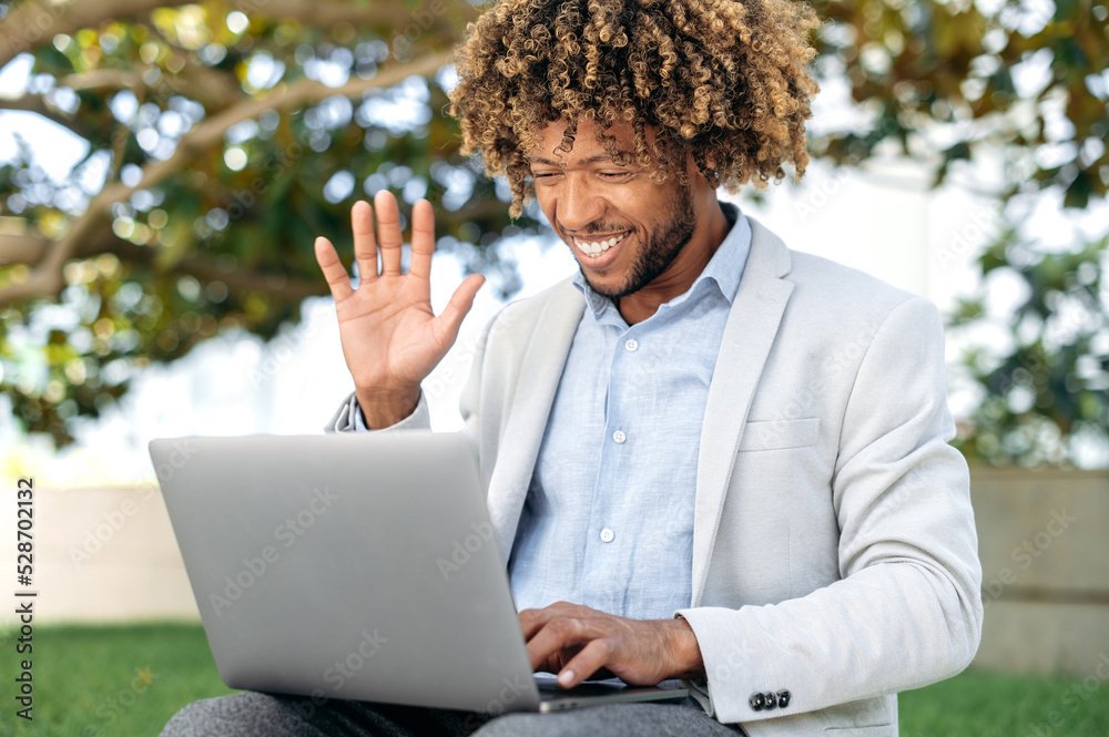 Online video communication. Positive mixed race curly haired man, company worker, mentor, using laptop for video conference conversation with colleague or client, greeting interlocutor, smiling