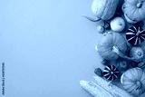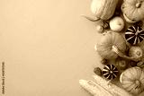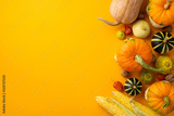 Autumn harvest concept. Top view vertical photo of raw vegetables pumpkins pattypans corn walnuts and physalis on isolated orange background with copyspace