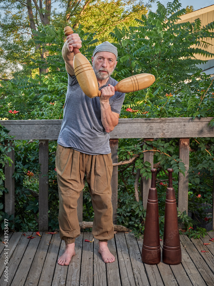 senior man (late 60s) is exercising with Indian clubs and heavy Persian meels in his backyard patio, functional fitness concept using traditional tools