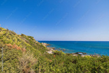 Beautiful view of rocky coast on turquoise water background in Mediterranean sea. Greece.