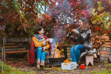 two happy joyful best friends sitting outside in autumn garden by campfire with bottle of red wine