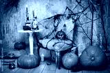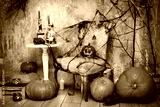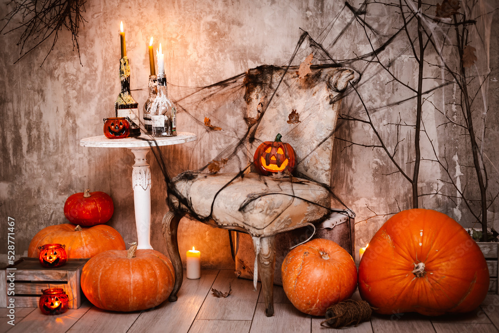 Background of decorations for Halloween celebration. A scary composition with Jack's pumpkin and burning candles, spider webs and a witch's broom on a concrete wall