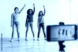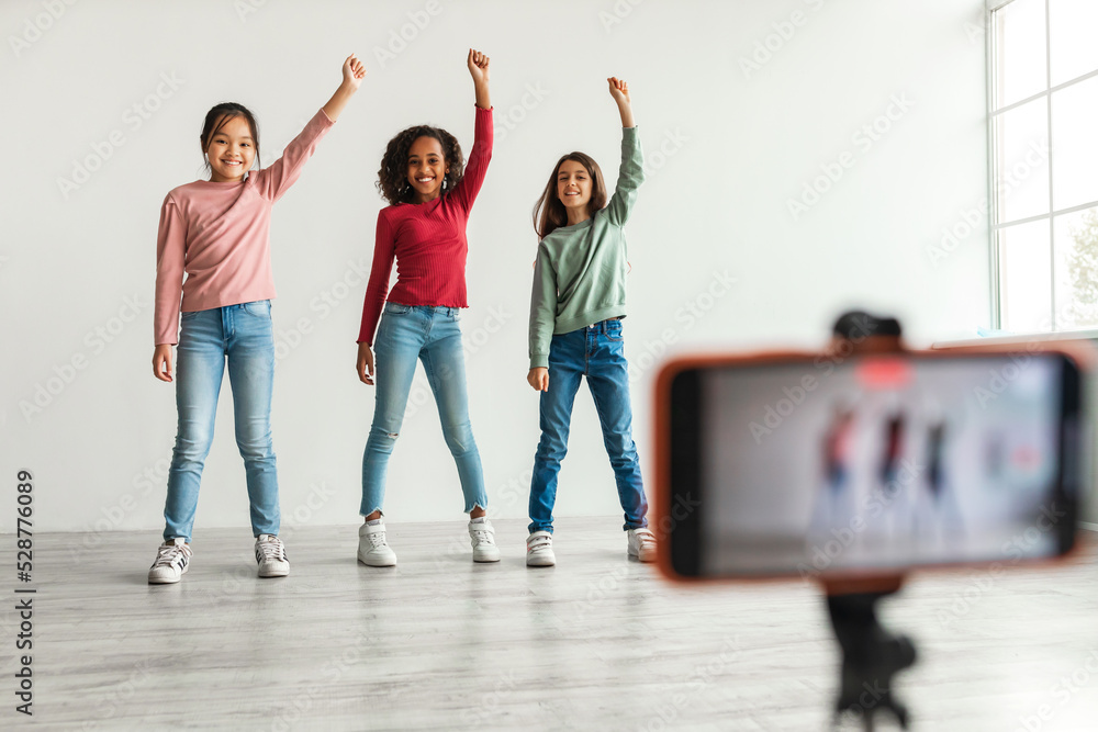 Three Diverse Blogger Girls Making Video On Smartphone Indoors