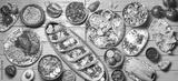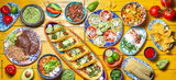 Mexican festive food for independence day independencia - chiles en nogada, tacos al pastor, chalupas pozole, tamales, chicken with mole poblano sauce. Yellow background.