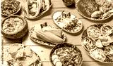 Mexican festive food for independence day independencia - chiles en nogada, tacos al pastor, chalupas pozole, tamales, chicken with mole poblano sauce. Yellow background.