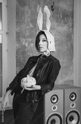 woman in a leather jacket with makeup in the carnival image of a hare for an adult night club party Halloween