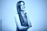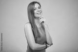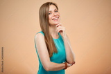 Smiling thinking smart woman isolated portrait on yellow brown background.