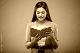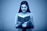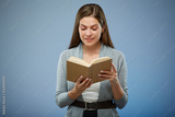Smiling girl student or woman teacher reading book, portrait isolated on blue..