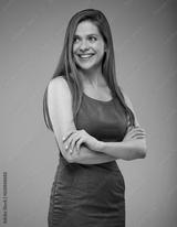 Young smiling business woman with long hair in gray dress standing with arms crossed and looking side away. Isolated portrait.