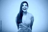 Happy young successful business woman looking up. isolated portrait.