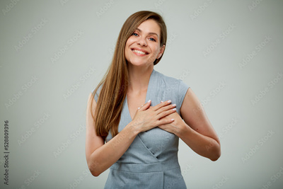 Happy young successful business woman holding hands on chest. isolated portrait.