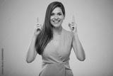 Smiling business woman pointing fingers up. isolated portrait on gray.