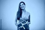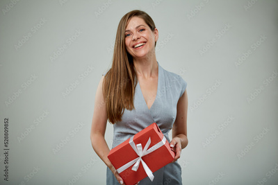 Happy woman holding red gift box with white ribbon. isolated studio female portrait.