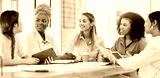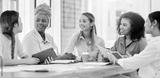 Marketing strategy, business women and collaboration teamwork in inclusive office room with diversity empowerment. Smile, happy and motivation people in communication, meeting and designer innovation
