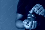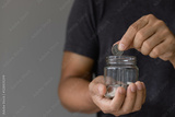 Saving money wealth and financial concepts, Male hand holding a glass jar piggy bank and putting coin there, Business, finance, investment, Financial planning, savings.