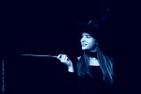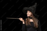 Young witch in pointed hat with magic wand in hands. Copy space for text. Isolated on black background. Halloween costume.