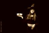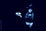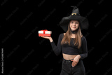 Smiling girl in pointy hat holds gift in her palm. Woman with gift. Isolation on black background. Copy space. Halloween
