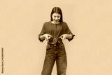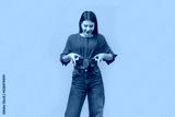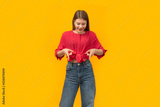 Smiling young woman in casual clothes and looking at the camera pointing with two hands to the down. Copy space.