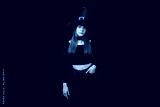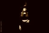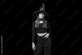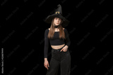 Portrait of young girl in pointed witch hat and black clothes is isolated on black background. Copy space. Halloween costume