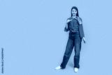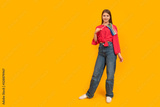 Full-length, portrait of young woman with flag of South Africa in hands. Orange background. Study and travel in South Africa.