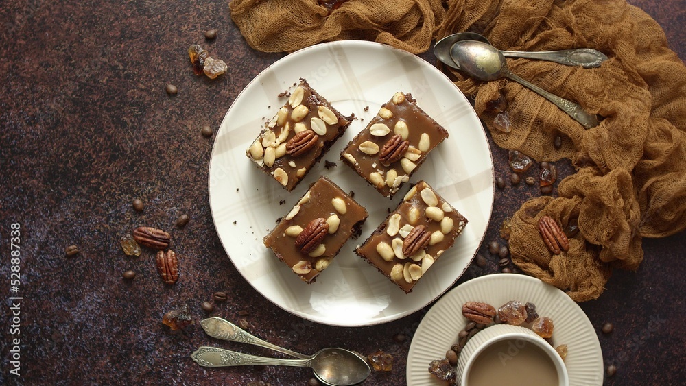 Top view of 4 square dark peanut brownies with nuts on a ceramic saucer