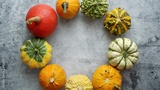 From above view of various kinds cute mini pumpkins placed in circle with copy space