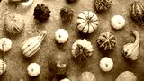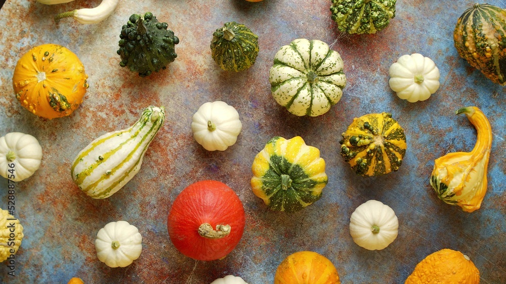 Colorful mini pumpkins on rusty background. Fall background. Halloween or Thanksgiving celebration