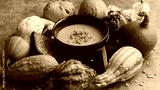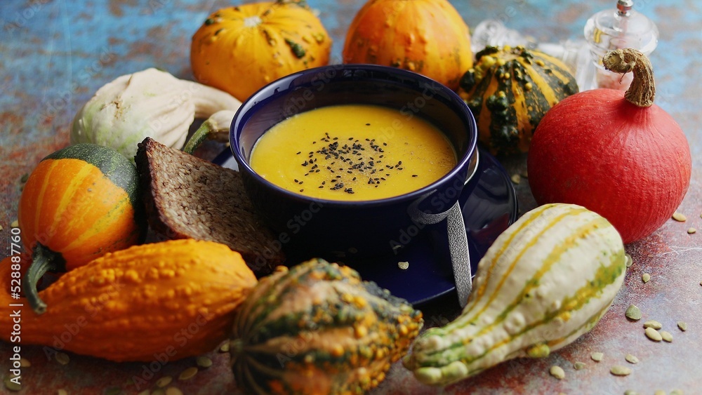 Vegetarian autumn pumpkin cream soup with seeds and colorful various mini pumpkins around