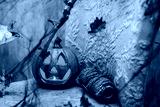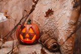 Background of decorations for Halloween celebration. A scary composition with Jack's pumpkin and burning candles, spider webs and a witch's broom on a concrete wall