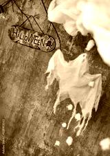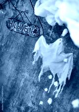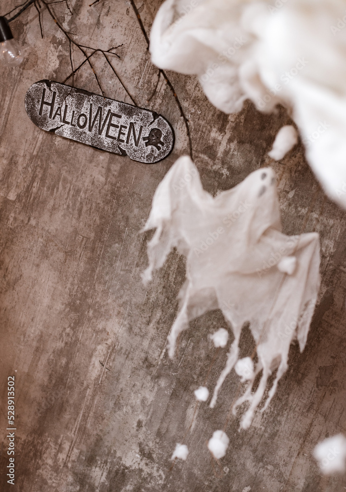 Halloween background on a concrete background with a cast and a sign with an inscription, free space for text Diy Halloween ghost of starch and gauze.