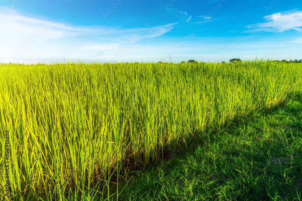 Scenic view landscape of Rice field green grass with field cornfield or in Asia country agriculture harvest with fluffy clouds blue sky daylight background.