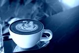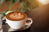 Hot coffee latte with latte art milk foam in a swan shape in cup mug on wood desk on top view. As breakfast In a coffee shop at the cafe,during business work concept