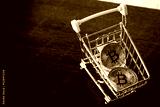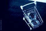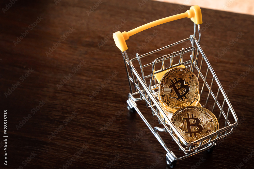 Close-up of Golden bitcoins or cryptocurrency coin or symbols in shopping cart in wooden table floor. Future currency concept.