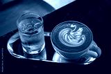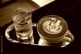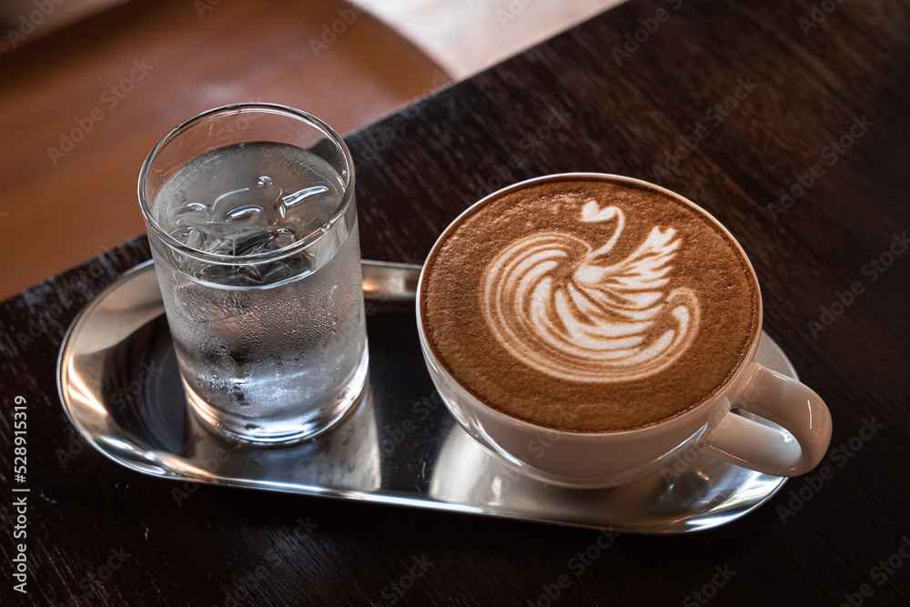 Hot coffee latte with latte art milk foam in a swan shape in cup mug on wood desk on top view. As breakfast In a coffee shop at the cafe,during business work concept