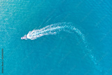 Aerial drone photo of speedboat sailing through the turquoise mediterranean sea. Top view