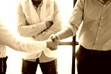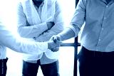 Architect shakes hands at meeting, meeting of two engineers or architects, shaking hands after discussion and meeting of new project plans, contracts for both companies, success, partnership