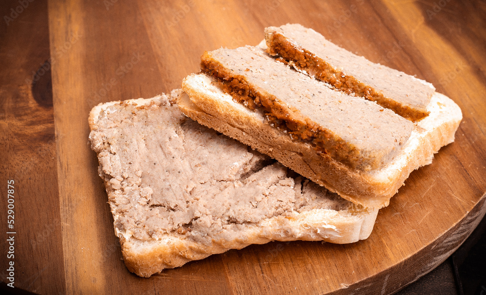 Sandwiches, toasts with meat pate, on a wooden cutting board. Traditional Polish baked meat product, Easter delicacy.