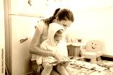 Front view mother read book to little daughter sitting on knees show letters pictures with finger kid smiles with interest. Children corner in the kitchen so that the child is always supervised.