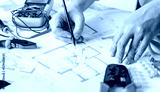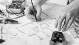 Man,repairer making electricity project in house.Repairs planning.Drawings,diagrams,plan for electrification of apartment,building.Devices,accessories,voltmeter,wires,screwdriver,pliers,tape measure