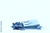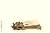 Fall Gift or Sale concept. Shopping paper bag, with golden maple leaf. autumn decor. Copy space. Thanksgiving. delivery