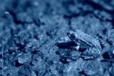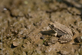Close-up of a small water frog (pelophylax) sitting on brown wet mud at the shore in nature. The frog is well camouflaged.