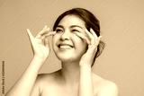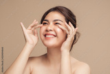 Closeup Asian woman with beauty face touching healthy facial skin portrait. Beautiful smiling Asian female model with natural makeup touching glowing hydrated skin on beige background.