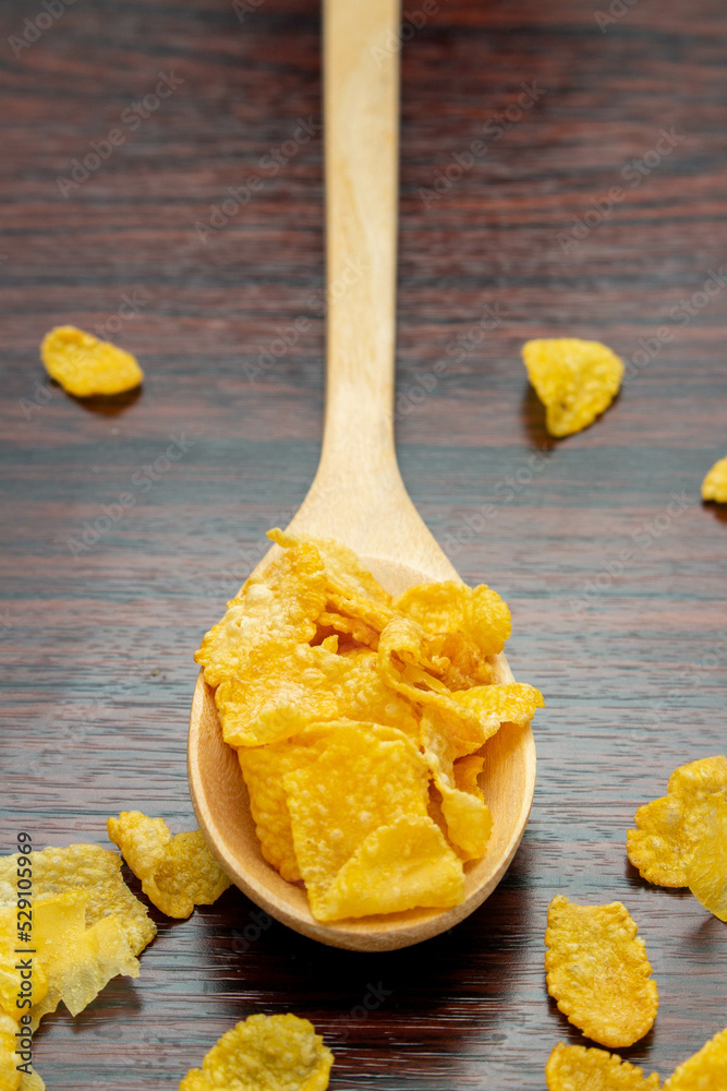 Breakfast cereal concept, Cornflakes in wooden spoon with cornflakes fragments on wood background