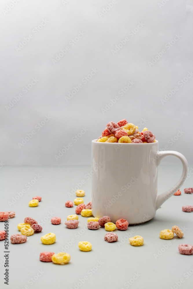 Breakfast cereal concept, Colorful ring cereals in coffee cup and falling on grey background