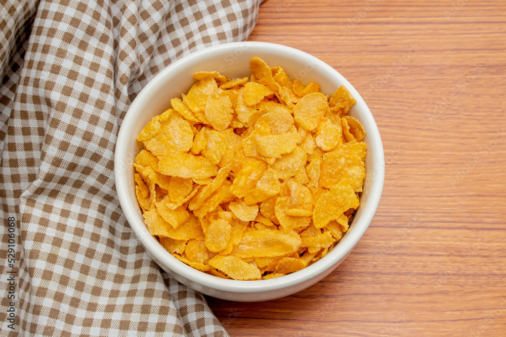 Breakfast cereal concept, Cornflakes in white bowl with gingham cloth on wooden background