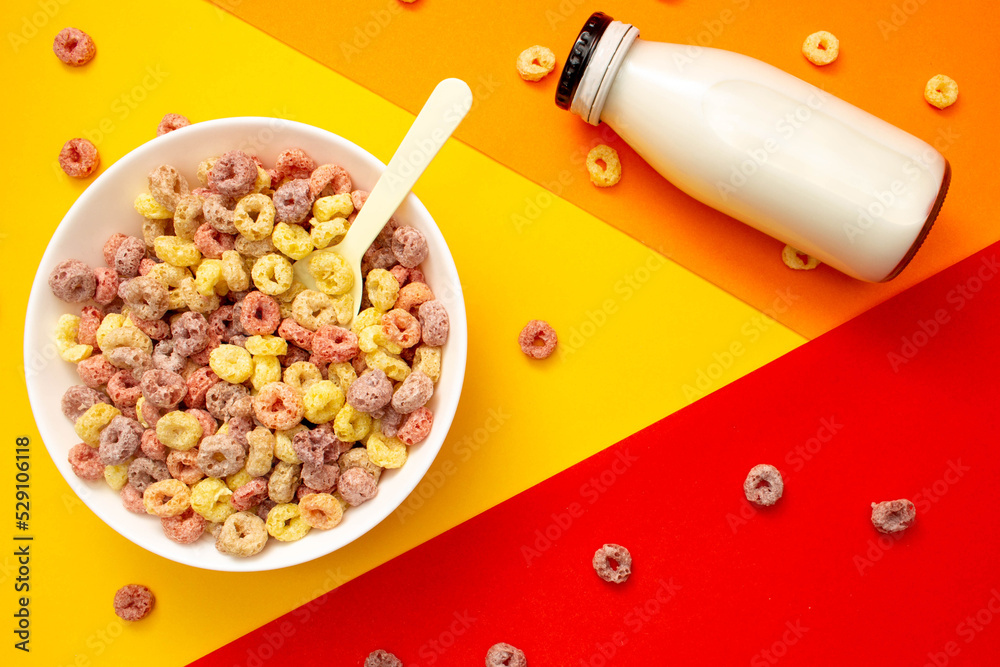 Breakfast cereal concept, Fruit ring cereals in bowl and milk in bottle on colorful background